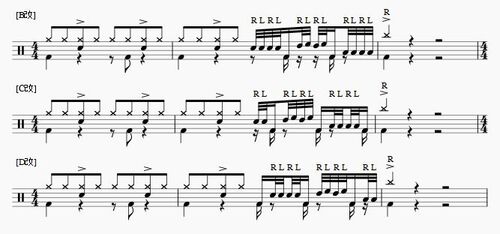 16分音符のフィルインの中に一部キックをはさみ込むこと それほど苦しまずにできるテクニカルフィルイン 今回はすこし違う趣きで。特定の楽曲ではなく一般的なフィルインの発想について紹介してみようかと思う。特にフィルインの中にキックを絡めたケースで…